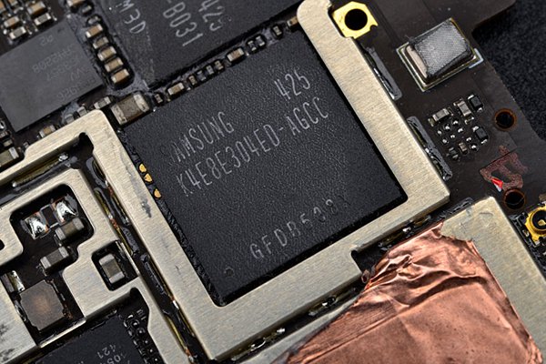 图为金立Elife S5.1主板上内置的最核心CPU芯片,该机采用了高通MSM8926四核CPU,其与RAM内存一同封装,CPU和RAM采用双层封装,手机使用三星的1GB RAM。