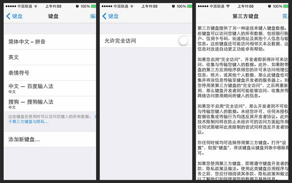 和之前的原生九宫格输入法一样,安装百度和搜狗之后还需要在键盘设置中添加这两个全新的输入法才能使用,而且默认状态下,这两个输入法的功能是受到限制的,需要在添加输入法之后再点击一下,然后打开“允许完全访问”之后才能开启包括换肤、滑行输入等更多设置和功能。