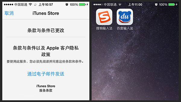 ▲通用中的键盘设置下多了一个“关于新的第三方键盘与隐私”的声明,详细内容请参看最右面的一幅图。而且在下载安装第三方输入法时还会弹出“App Store条款与条件已变更”的提示,需要重新同意之后才能够继续下载安装。安装后桌面上便会出现新添加的输入法图标,我们下载安装了百度和搜狗两个输入法,是不是有种在用安卓手机的错觉?