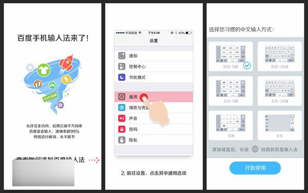 ▲百度手机输入法打开之后给出的是一个设置方法以及输入方式的选择向导,可以让首次使用iOS8第三方输入法的朋友更快上手。