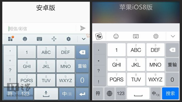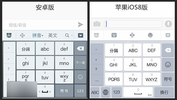 ▲通过上面这幅对比图,我们可以看到,相较于安卓版本的百度输入法,iOS8版本整体布局变化较大,功能按钮都有所调整。比如数字菜单切换到左侧,右下方输入时也会变成和原生九宫格同样的蓝色按钮、底部加宽的空格键等,都针对iOS用户的使用习惯做出了调整。安卓用户转移过来可能还要适应一下。