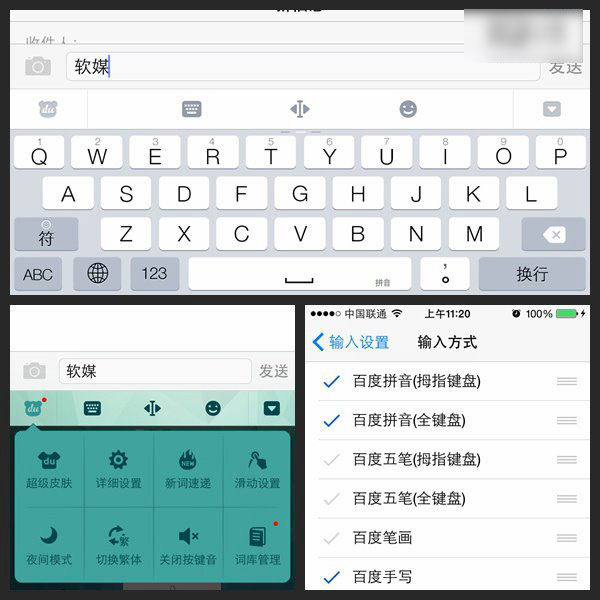 ▲上面是百度手机输入法iOS的一些其他功能展示,比如最上面的横屏效果,左下方的切换皮肤后的效果,以及右下角的全部输入方式一览。值得一提的是只有在设置中开启“允许完全访问”后才能使用这些功能,词库功能也很好用,可以加入三维词库、分类词库、云优化以及添加通讯录联系人等功能。