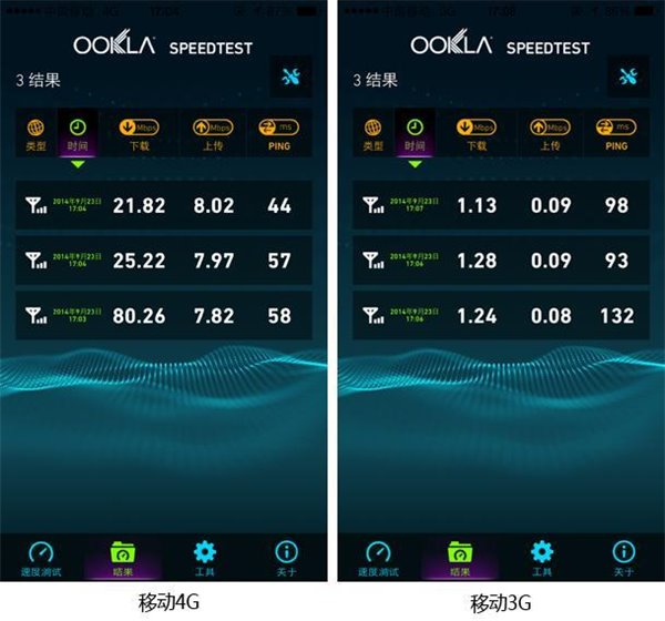 移动3G和4G的情况还是一如既往的稳定,4G测速下行基本在20Mbps以上,偶尔抽风到了80Mbps的情况可忽略,而且移动4G的信号覆盖我也测了一下,在北京不仅五环外信号也是满格,室内也能用,就连一些远郊区县也都能搜到信号,话说移动做4G也是蛮拼的了。3G方面则是无力吐槽的龟速1Mbps以上,但好歹比较稳定,因此对于广大移动用户来说,iPhone 6 / 6 Plus还算是比较理想,不仅3G/4G全能用,现阶段如果想跳到联通3G也能支持,不管网络怎么换,反正买iPhone 6是没错。