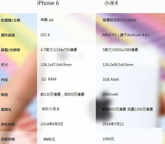 摄像头:iPhone6 前130万像素,后800万像素,小米4 前800万像素 后1300万像素