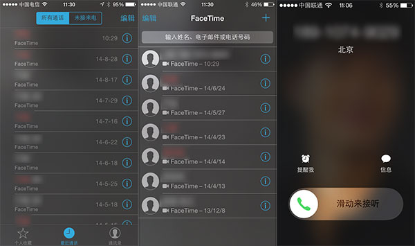 新增了来电归属地,Facetime的列表重新改换了版式。(左一为iOS 7,中间和右侧为iOS 8)