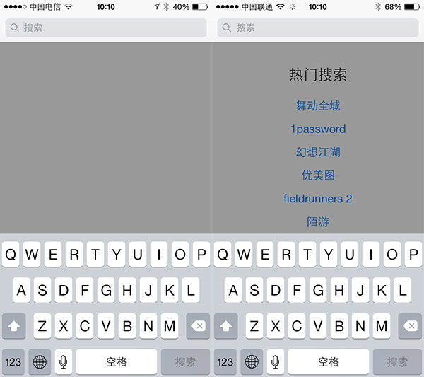 搜索界面出现了智能推荐——说白了就是关键字广告。(左为iOS 7,右为iOS 8)