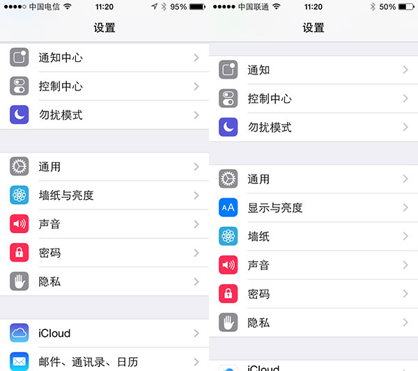 控制中心迎来了一次UI更新,略丑,可以预见会有很多处女座以及类处女座介意这个而不去升级。(左为iOS 7,右为iOS 8)