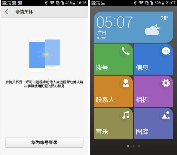 手机拥有特色的“亲情关怀”模式,可以实现屏幕共享,远程协助的功能,这对于入门级用户来讲尤为实用。荣耀畅玩4系统当中设有简易模式,进入这个模式后,界面非常简洁,文字与图标被放大,显得更为直观,通俗易懂。