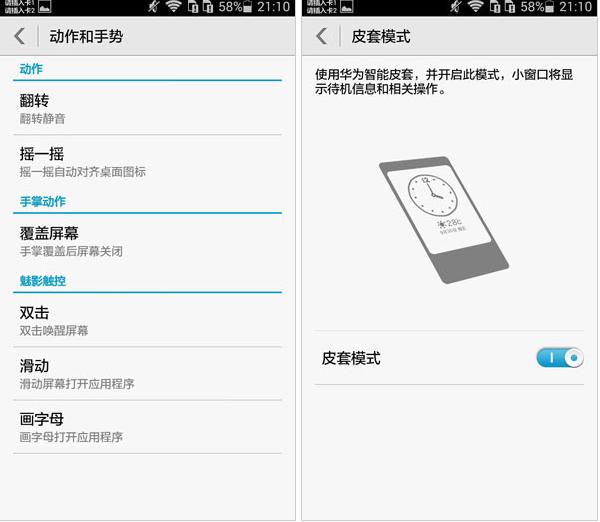 用户还可以设置动作与手势功能,让手机显得更智能,提升用户体验。荣耀畅玩4支持使用智能皮套,并有相应的显示模式。