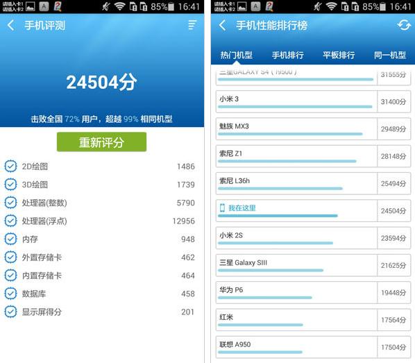 在鲁大师手机评测当中,荣耀畅玩4表现优于不少搭载高通400 1.2GHz或联发科MT6582 1.3GHz四核处理器的同级机型,在图中的排名甚至超越搭载高通骁龙600 1.7GHz四核处理器的小米2S,这样的成绩让人惊喜