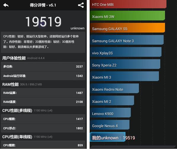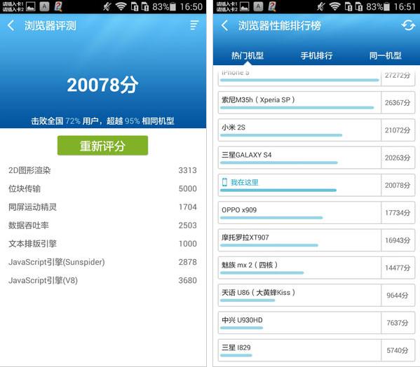 在鲁大师浏览器评测当中,手机的表现不俗,接近三星上年度的旗舰机型GALAXY S4,优于搭载高通APQ8064 1.5GHz四核处理器的OPPO Find5。