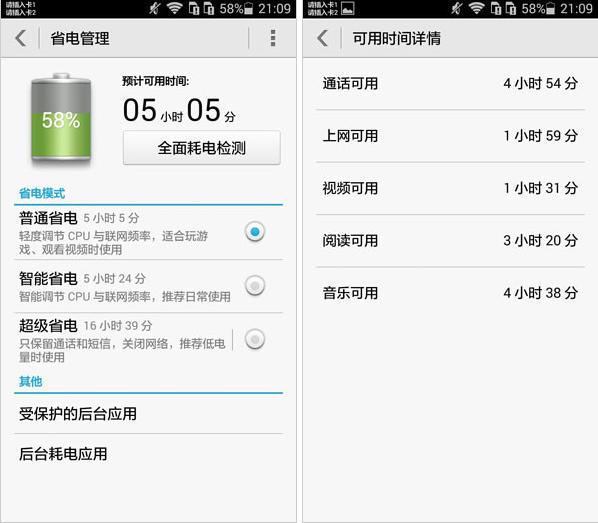系统当中设有省电功能软件软件,拥有普通省电,智能省电与超级省电这三种模式,从里面的列表用户可以清晰了解手机应对各种操作的续航时间,即使是在手机快没电但要进行操作的时候,心里也更有底。