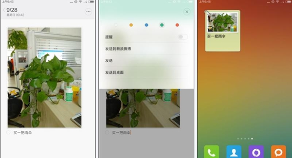在发送到桌面时,Flyme 4.0所有便签必须位于同一个小部件中,而MIUI 6则可以给每一条一个小部件,灵活性更高一些。