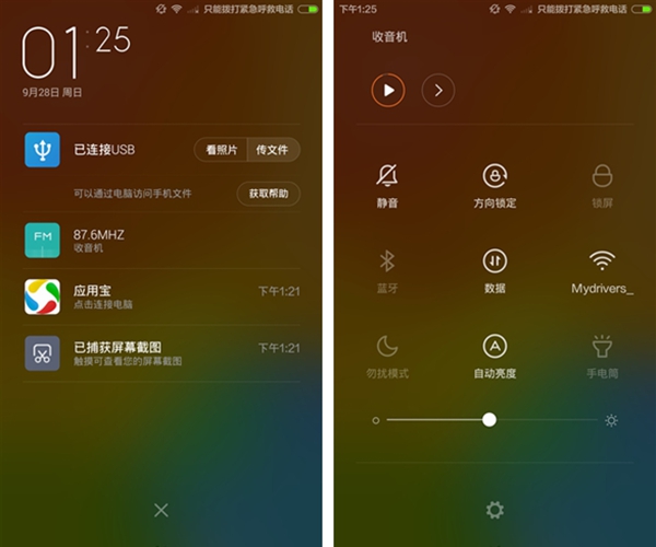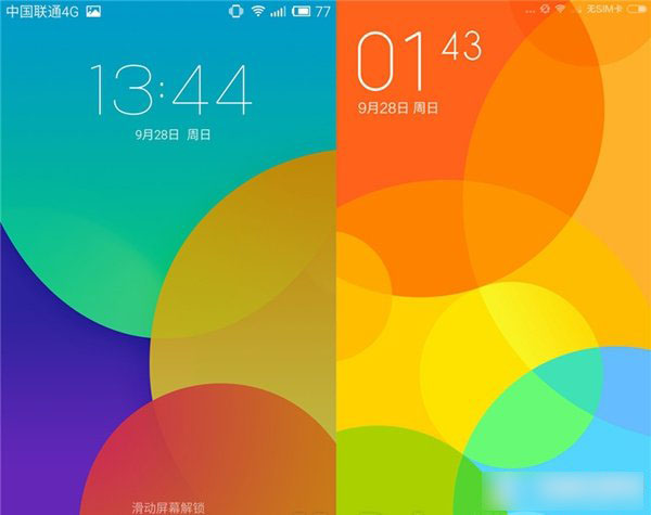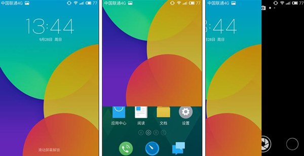 Flyme 4.0采用的是经典的滑动方式,MIUI 6则是淡入淡出方式,交互上没有多少差异,包括上划解锁、下划通知栏、左划调出相机,不过Flyme 4.0还提供了右划动作,可自定义打开应用。