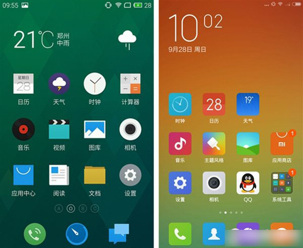 整体色调上,Flyme特点是简约、整体给人清新淡雅的感觉;而MIUI则强调色彩,给人很强的视觉冲击力。