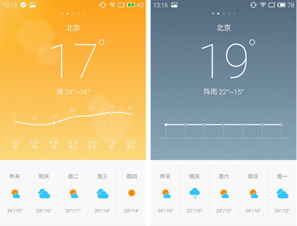 对比来看,MIUI 6更富设计感,而Flyme 4.0在一周未来天气上的易读性更为出色,黄、蓝两种色调搭配起来格外醒目。