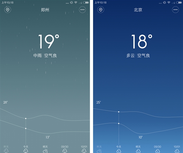 Flyme 4.0终于内置了天气应用,MIUI 6也采用了全新的天气界面,两者的美观性和动画都非常出色,并且都为不同天气提供了不同的背景色调。