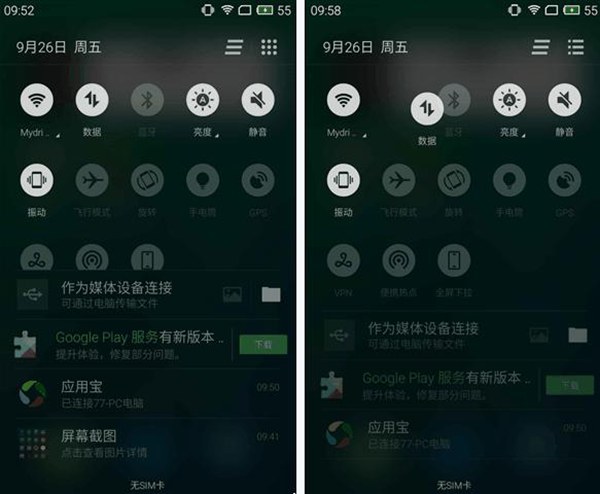 对比两者的功能,MIUI 6不再支持对快捷开关进行排序和隐藏,略显遗憾,但支持长按进入具体设置界面;而Flyme 4.0虽然支持排序,但不支持隐藏和长按进入设置。