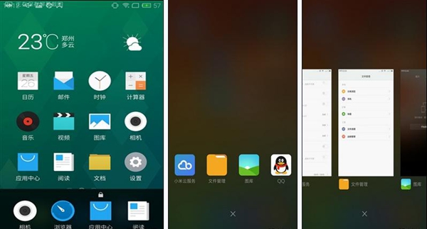 后台界面,Flyme 4.0依然是目前效率最高的屏幕底端上滑调出,而MIUI 6也遵循了Android最新规范,通过单击“菜单键”也可调出后台,便捷性上打个平手。