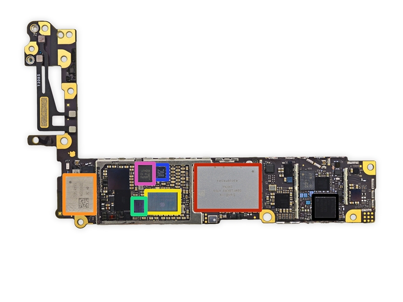 其他一致:APL1011 A8处理器(红色)、Skyworks 77802-23 Low Band LTE PAD(黄色)、Avago A8020 High Band PAD(绿色)、Avago A8010 Ultra High Band PA + FBARs(蓝色)。