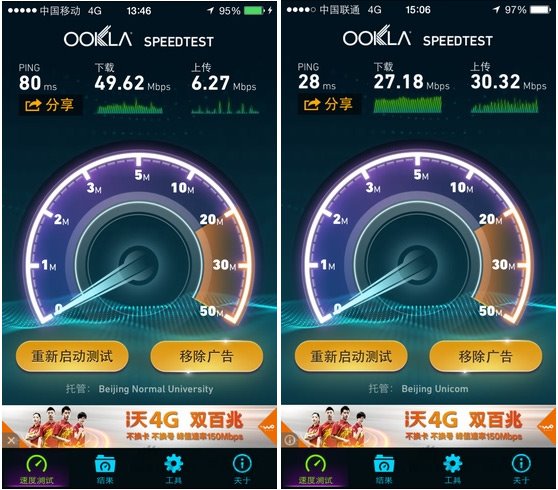 ▲在北京用移动4G(左)和联通4G(右)的网速