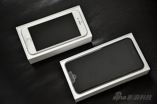 此次拿到的是白色的iPhone6和黑色的iPhone6 Plus行货公开版(A1586和A1524)。两款手机的包装除了大小之外没有任何区别,包装盒上也没有任何彩色的手机菜单或界面内容而只有轮廓,侧面则是iPhone的字样和苹果的logo,并未写明是6还是Plus,但根据包装大小就可以轻松判断了。