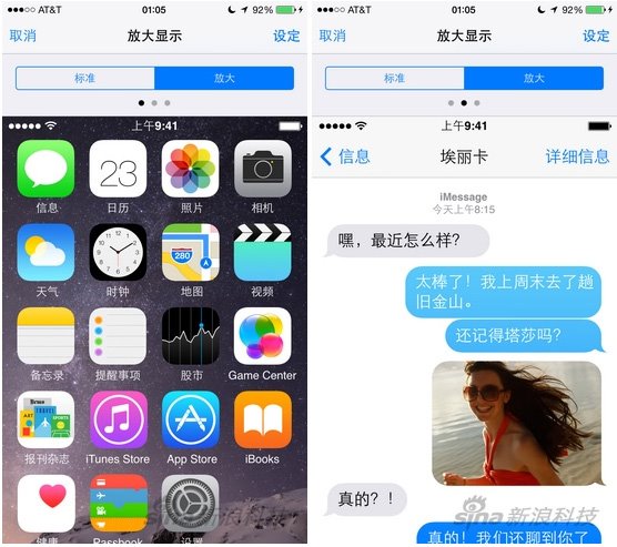 另外,苹果为iPhone 6和iPhone 6 Plus增加了“放大显示”功能,简单来说就是可以把主菜单、信息和邮件等的图标和应用变大显示变大,再加上字体大小调节功能,对于想为家里父母买iPhone的网友来说是个好消息。
