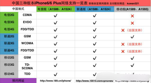 国行版本的iPhone 6/6 Plus一共有四种型号,除了移动的定制版需要出国漫游时才能使用FDD-LTE和WCDMA网络,电信和联通版均为全网通版本。