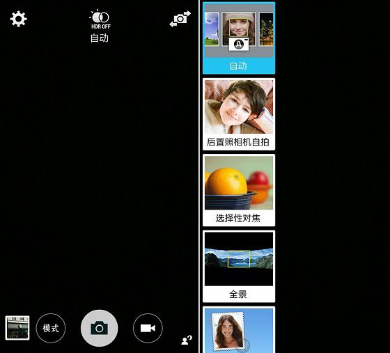 拍照功能上,三星Note拥有普通和专业两种拍照模式,另外还支持后置相机自拍功能,可以自动识别脸部并对焦,对焦完成后自动拍照。
