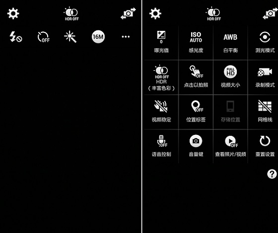 拍照界面方面,三星Note4相机界面清爽,拥有闪光灯、计时器等常用功能调出便捷,而使用率较低的手动调节选项也被隐藏在三级菜单内,如下图所示。