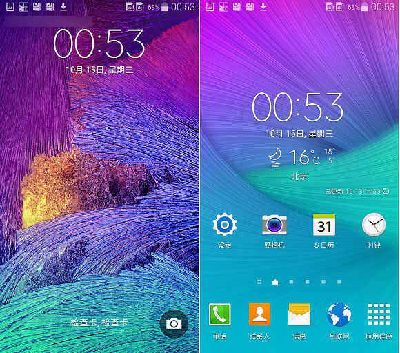 三星Note4桌面界面壁纸采用了大红大紫的水粉画界面,锁屏背景很扎眼,主界面背静很清新,虽然色彩元素也很多,但整体要比三星Note 3清爽不少,如下图所示。
