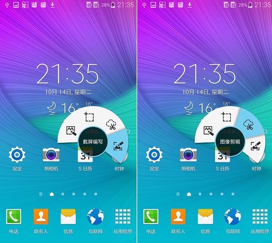 系统体验方面,三星Note4最大的亮点在于拥有S Pen浮窗指令操控体验,具备非常出色的人机互动交互体验。作为Note系列的点睛之笔,S Pen在三星Note4中也进行了一番休整,当然,抽笔弹出“浮窗指令”和紧贴屏幕时按键呼出“浮窗指令”的交互方式并没有改变,改变的是“浮窗指令”所集成的功能缩减至4个,界面更为简洁一些,如下图所示。