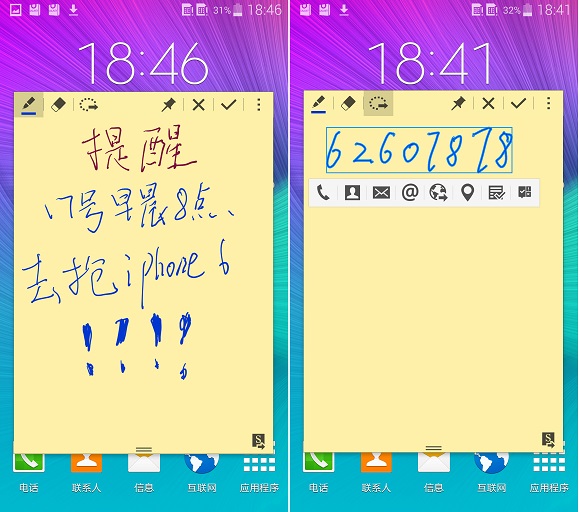 在智能备忘录中,可以记录近期重要事件或代办事宜,并将其订选到主屏当中,起到一个提醒的作用。另外,智能备忘录还可以识别你输入的数字或文本,之后给出相应的操作选项,比如你写上一组电话号码,智能备忘录识别后可直接给该号码拨打电话,如下图所示。
