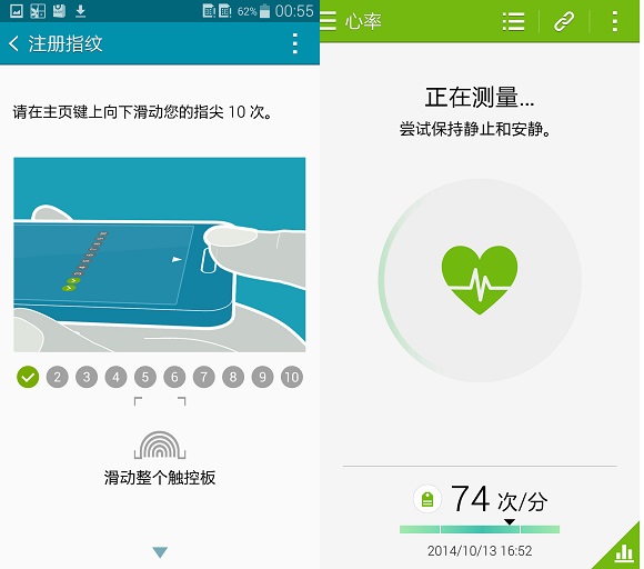 三星Note4加入了指纹识别解锁和心率检测功能,无意也是系统体验中的一大亮点,两者各有自己发挥的空间,指纹识别用于安全解锁和移动支付,心率检测辅助S健康,但是从目前情况来看,指纹识别的体验相较iPhone还有很大差距。