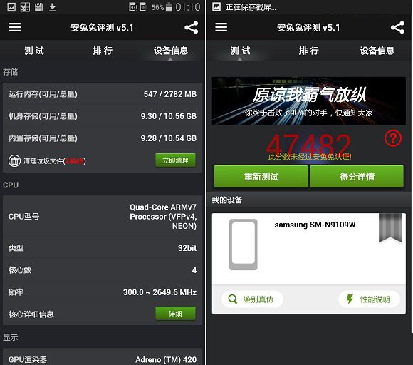通过跑分测试可以看出,三星Note4安兔兔跑分达到了47482分,并配和高通805内置的顶级GPU图形性能,在性能方面,三星Note4无疑使目前安卓手机阵营中,性能最强的旗舰机,不过在3D图形性能方面,三星Note4比iPhone6要差一些。