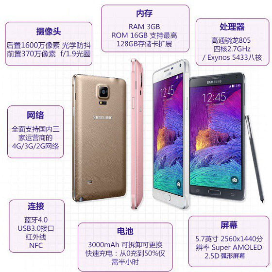 | 网络支持 | 移动/联通/电信 三大版本(支持4G) 【三星Note4版本型号大全】 |