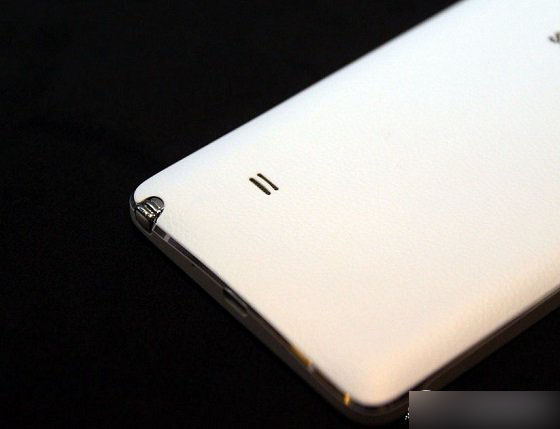 机身背面方面,三星Note4背面依旧是防皮革的塑料材质,其中的纹理起伏更大,去掉了车线,从视觉上要比三星Note3更像一块皮革。手感方面,尽管并非真正的皮革材质,不过相比普通塑料材质机身还是要出色不少。