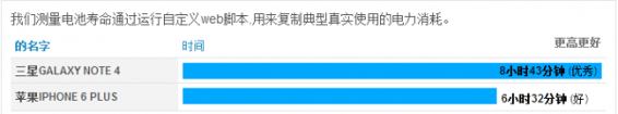 经过测试,Note 4 拥有8小时43分钟的良好成绩,而iPhone 6 Plus 只有6小时32分钟。三星 Galaxy Note 4 还支持更换电池,在续航方面,iPhone 6 Plus 稍逊一筹,看来长时间外出,携带一块移动电源很有必要的。