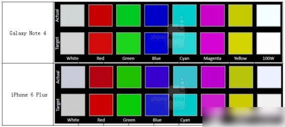 在色彩表现上,Note 4 屏幕在基础模式下的色温为6667K,十分接近标准的6500K,可以说是不偏暖也不偏冷,显示效果足够真实,而iPhone 6 Plus 的显示色温为7318K,相对有些偏冷。