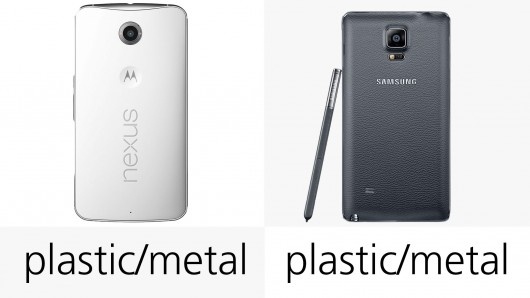 在机身材质上,三星和谷歌这次都采用的是金属边框和塑料背壳,由于 Nexus 6 和 Galaxy Note 4 的尺寸都不小,塑料的机身无疑减轻了机身重量,增加了握持的舒适性。