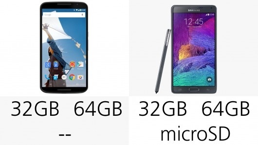 谷歌 Nexus 6 和三星 Galaxy Note 4 都有32GB和64GB两个版本,不过,三星还支持外置microSD卡,业界良心啊。