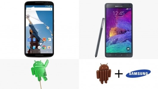 Nexus 6 搭配的是最新的安卓5.0,而 Note 4 运行的是Android 4.4 KitKat 系统,搭配三星自家的 TouchWiz UI,相信不久,三星也会为 Note 4 升级到安卓5.0。