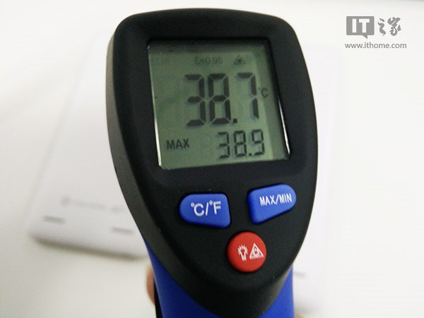 测试方法:我们测试时的环境温度为24.8℃,然后分别将两款机型在连接WiFi的状态下运行二十分钟《狂野飙车8》游戏,然后使用测温枪测试其背面最高温度。