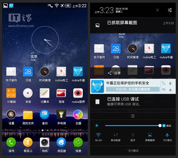 ▲中兴V5 Max的主界面以及下拉通知栏,为了适应大屏使用,V5 Max图标调整的更小一些,略显拥挤。