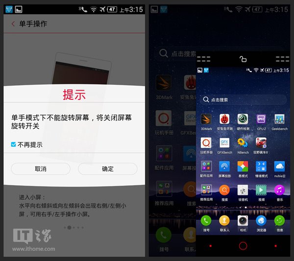 ▲为了优化大屏操作,现在V5 Max也加入了“单手操作”模式,在下拉通知栏快捷开关中开启该功能后,可以通过左右倾斜手机,让手机进入“小屏”模式,不过,个人感觉底部的三枚虚拟按键似乎高度太高,如果整个主界面再稍微降一下的话,可能更适合单手操作。另外,这个红圈充满了浓浓nubia既视感。