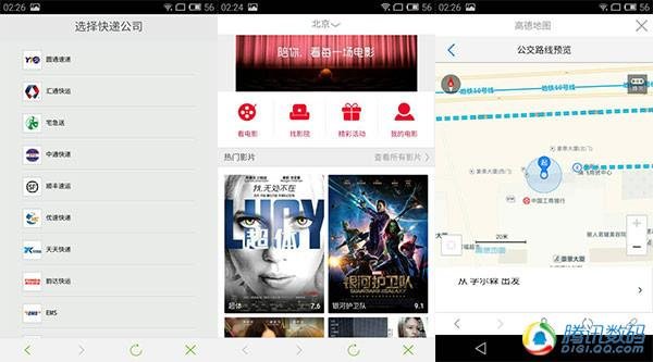 YunOS版本最左边的这一屏是无法修改和删除的,在YunOS 3.0发布会上也对这一屏进行了重点介绍,简单来说,就是在这一屏上以卡片的方式的展示着一些按生活场景归类的快捷图标,如娱乐、居家等,点击每个卡片可以进入一个网页方式呈现的“应用界面”,通过这些“卡片”,用户可以不用安装应用直接使用应用的功能。目前所有加入“我的卡片”的应用都是阿里系的,如快的打车、美团团购、高德导航等。如果你不想装那么多的应用又想要用到这些服务的话,这一屏的功能对于你来说就很好用了。