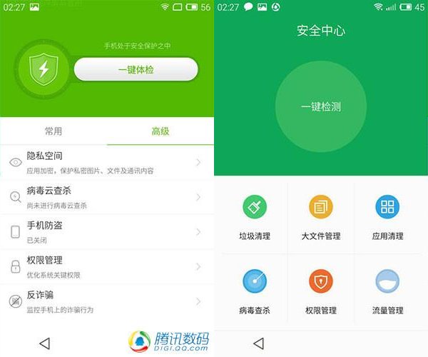 作为一致强调安全性的YunOS自然还是会对MX4的安全性进行更严格的把控的,这种把控主要体现在两点:首先内置软件安全中心进行了很大幅度的调整,YunOS版本的安全中心功能更丰富界面也更加友好;其次在发布会上阿里表示自己的系统永远不会被root,在我们的时机测试中也确实无法用主流的root工具对系统进行破解,这在一定程度上也增加了系统的安全性。