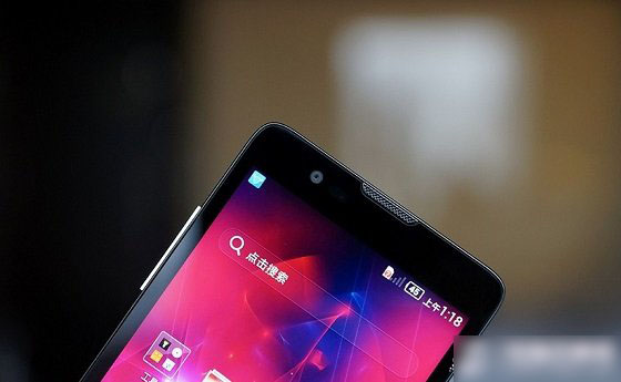 中兴V5S屏幕上方靠边缘的地方设置了金属网听筒,以及前置500万像素摄像头、距离感应器、光线感应器等基本小部件,如下图所示。