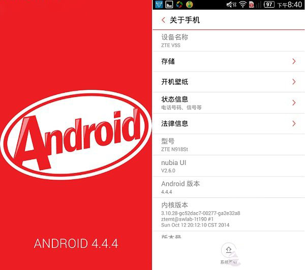 中兴V5S运行的是基于Android 4.4.4内核的nubia 2.5 UI系统界面,nubia系统设计已经十分成熟,作为国内老牌知名手机品牌,中兴手机UI设计方面可谓稳定扎实,其系统主打简单而易用。