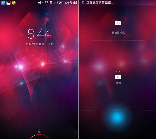 nubia UI2.5默认锁屏壁纸和桌面壁纸采用红黑色梦幻背景,解锁界面设计成了三段式,向上滑动至中间段即解锁,滑动至最上段即可快速进入相机,方便用户抓拍,解锁设计上可谓十分实用。